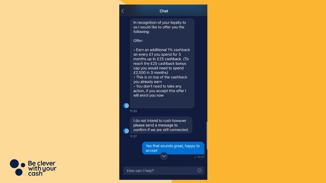 A member of the Be Clever With Your Cash Facebook group shared his recent experience of asking American Express the question over chat and was offered an additional 1% cashback on his Amex card on top of what he earned already.