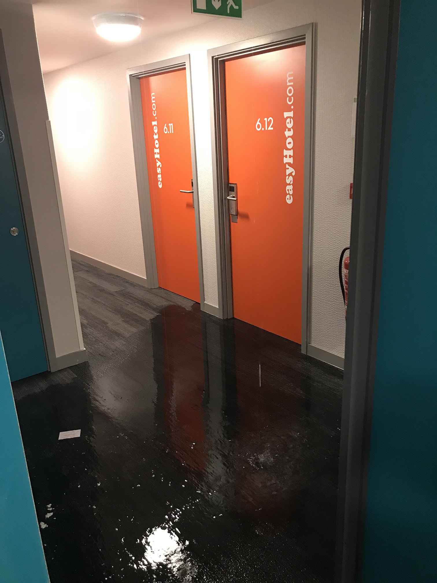 The fire brigade arrived just before 1am and left not long after. I didn’t speak with them but other guests reported them as saying people really shouldn’t go back to their rooms. When EasyHotel’s maintenance crew arrived at 2am they found water had also come through the main electrical switcher cupboards, as well as knocking out some of the fire alarms. I was told that really no one should have been allowed back into the hotel until this had been checked and repaired.