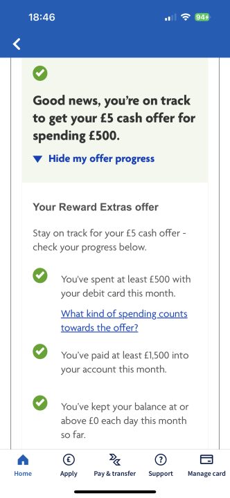 Within the Halifax app you’re able to check your progress so you know that you’ve done what you need to do in order to get your reward.