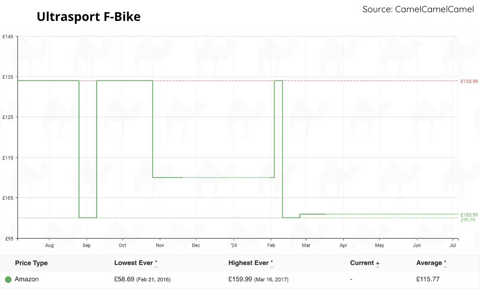 A friend of mine, Jen bought herself an UltraSport F-Bike on Prime Day last year. The Bike was £133.99 at the time and was reduced to £79.99 on Prime Day. This was the lowest price on this item since 2016. It was never reduced as far as this before it was removed from Amazon, so Jen got herself a pretty good price.