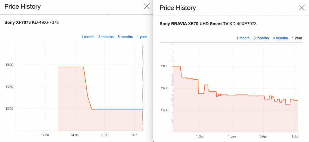 So armed with this information I had a quick search for Sony TVs with similar model numbers And not only did I find a similar number, I found an exact match with just one difference. There was an ‘E’ for 2017 in the model number. And this Sony KD49XF7073SU cost just £499.