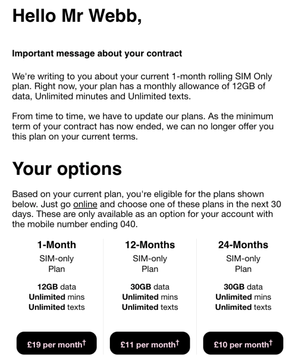 Well, late last month I got the following email from Three with a similar ultimatum. Choose a new contract at a lower price or be moved automatically onto an alternative rolling contract (at more than double what I pay now). In both cases, it’d be a new tariff under the new terms. And therefore without the Go-Roam benefit.