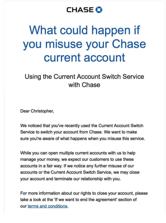 Chase Bank has messaged some customers using additional current accounts with them as dummy accounts. This is where the account is opened, then switched away to another bank in order to take advantage of switching deals.