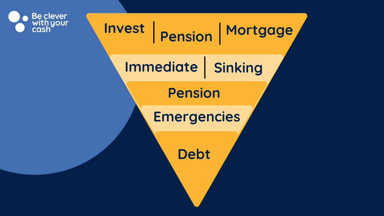To help you decide where you should be prioritising your extra cash, I’ve created this ‘savings pyramid’. It’s inverse, meaning the pointy bit is at the bottom.